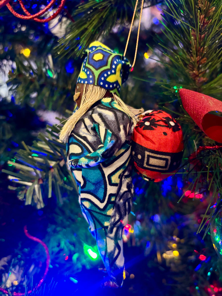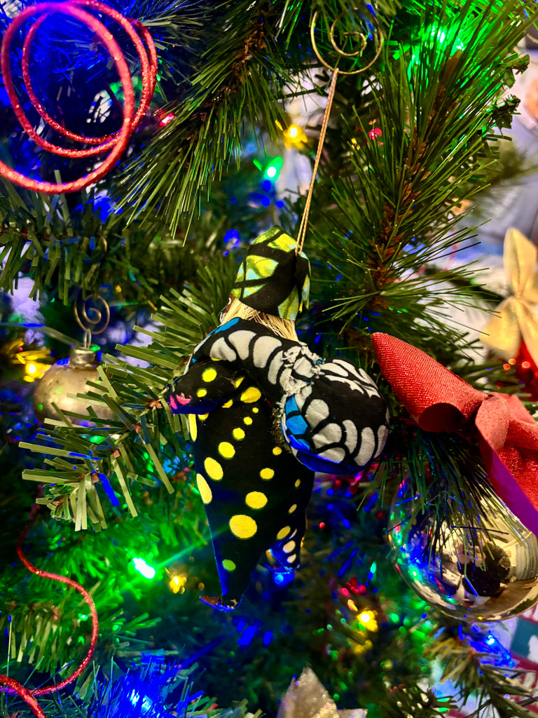 Approximately 6" tall. Handmade in Uganda from paper mache, and other natural materials with colorful African fabrics.